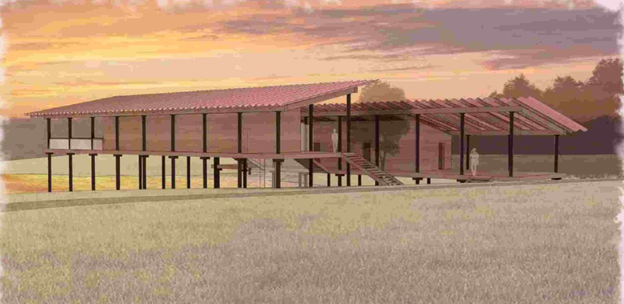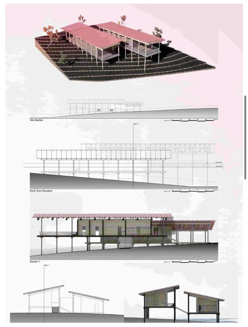 The goal of this field house design was to seamlessly integrate it with the natural surroundings. Inspired by Kengo Kuma's Horai Onsen Bath House, I minimized walls and designed columns to mimic the upward shape of surrounding trees. The walls are set deeper within the structure to avoid clear-cut boundaries, creating a more immersive experience. Using wood enhances the sensory connection to nature through smell, sight, and touch.