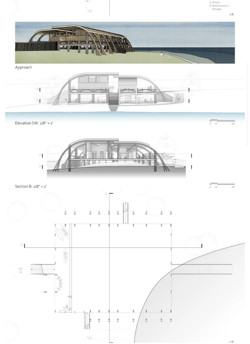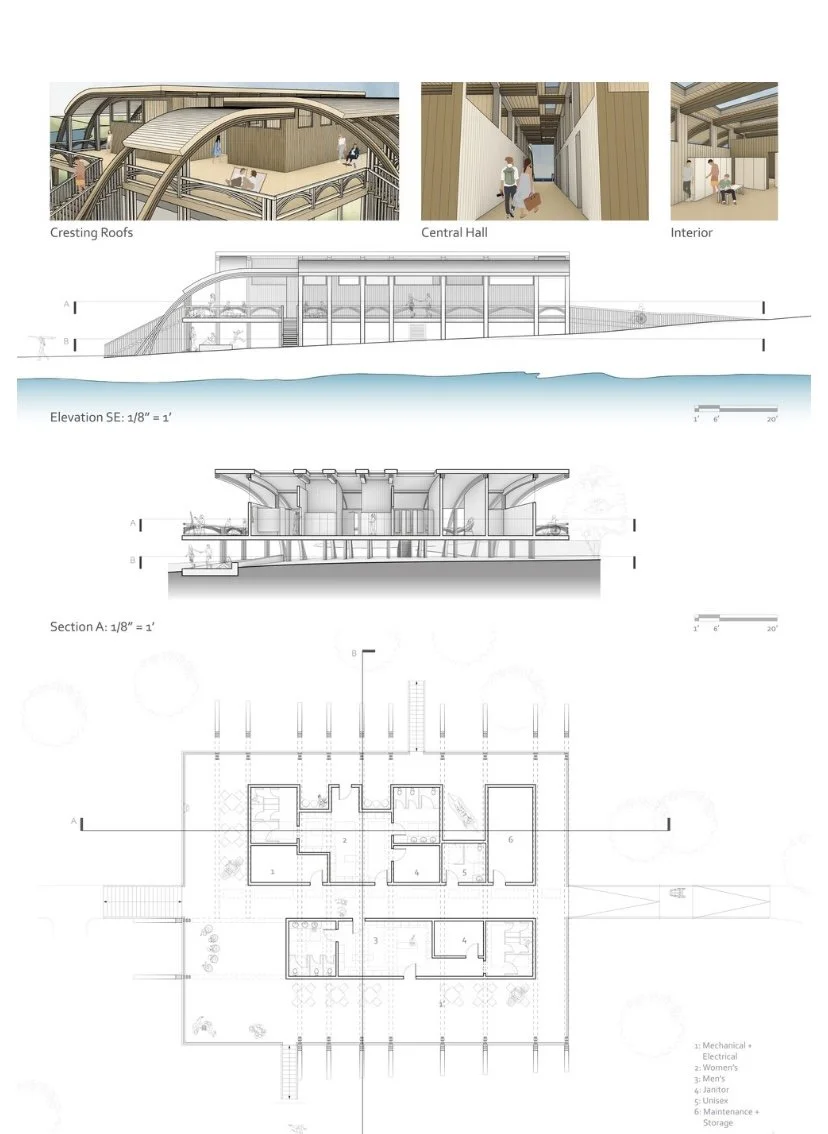 The field house is located between the Snow Center and Sailing Club docks, angled to capture sunlight on both horizontal facades at sunrise and sunset. This orientation enhances views and creates dynamic shadows. Positioned near a preexisting path, the building ensures quick and easy access for users.